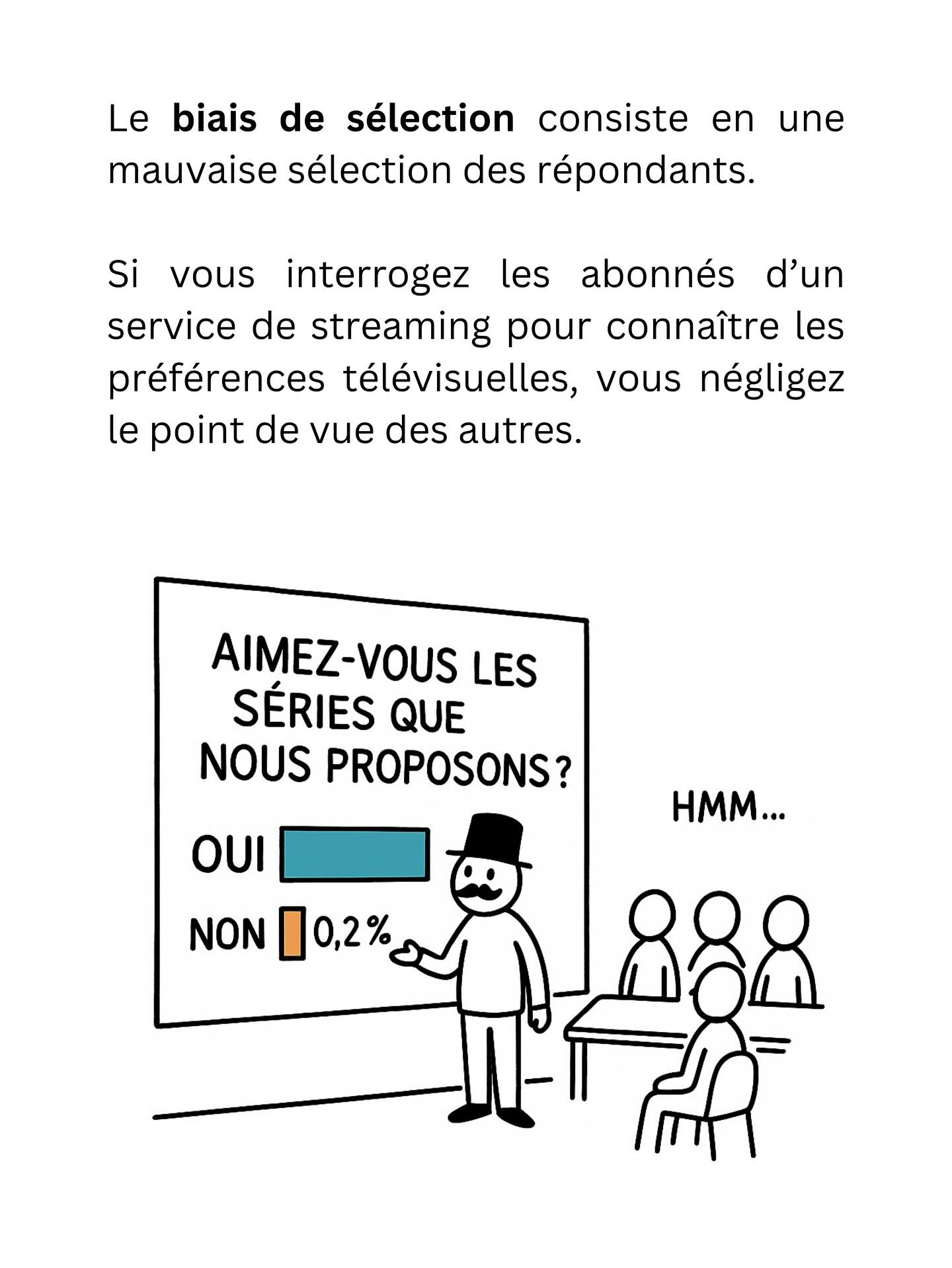 Le biais de sélection consiste en une mauvaise sélection des répondants. Si vous interrogez les abonnés d’un service de streaming pour connaître les préférences télévisuelles, vous négligez le point de vue des autres.