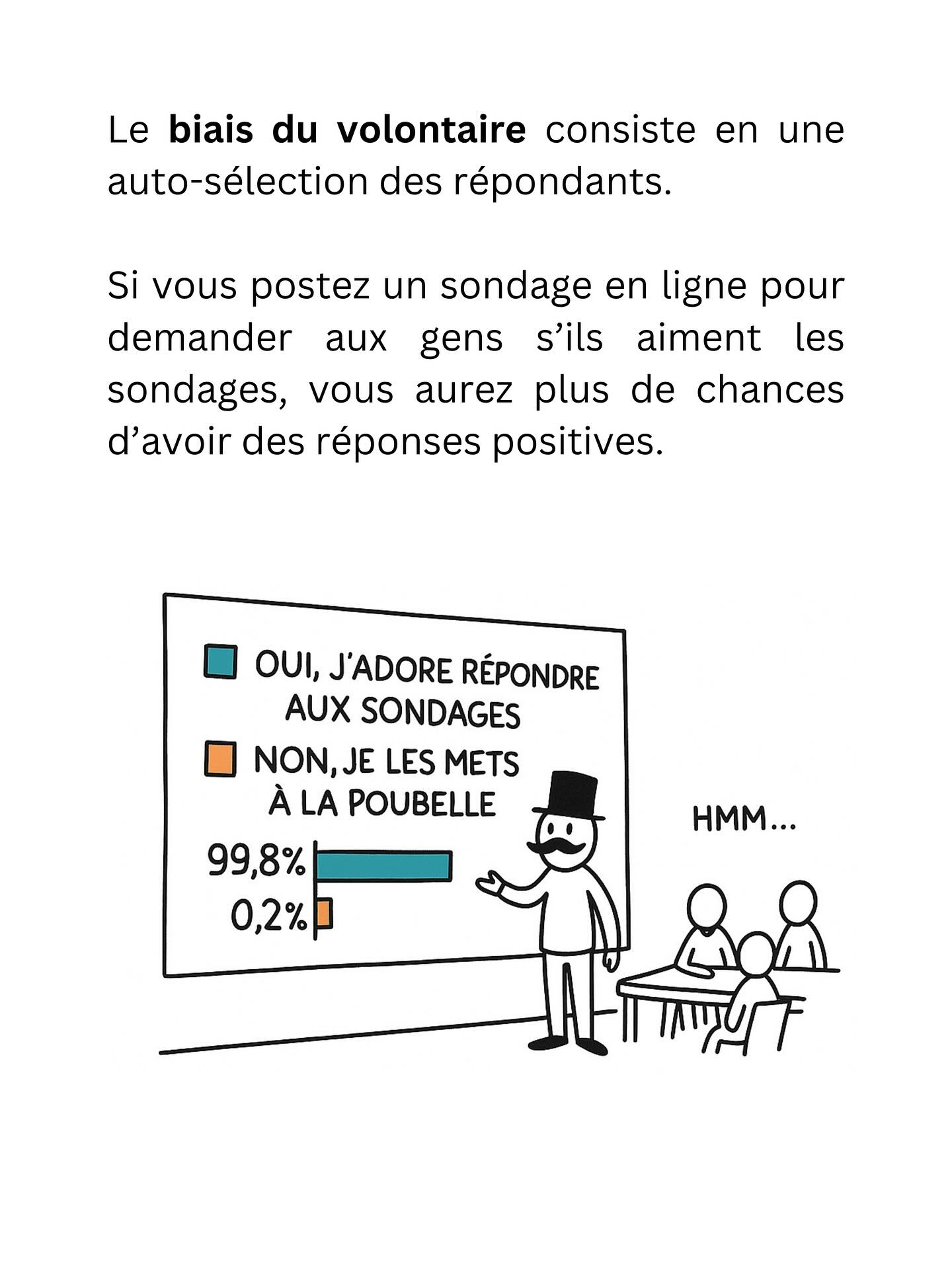 Le biais du volontaire consiste en une auto-sélection des répondants. Si vous postez un sondage en ligne pour demander aux gens s’ils aiment les sondages, vous aurez plus de chances d’avoir des réponses positives.