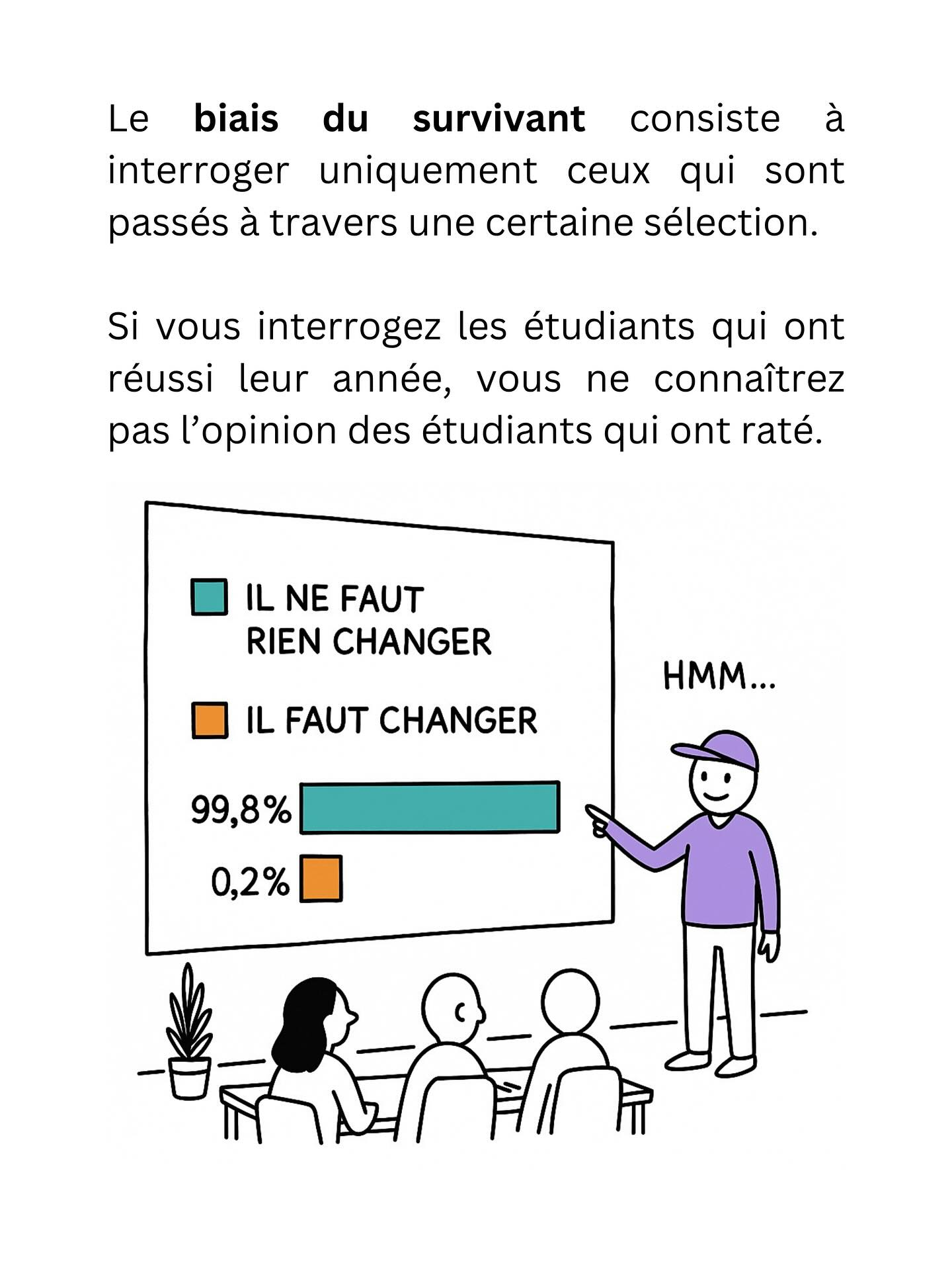 Le Biais de succès ou du survivant consiste à interroger uniquement ceux qui sont passés à travers une certaine sélection. Si vous interrogez les étudiants qui ont réussi leur année, vous ne connaîtrez pas l’opinion des étudiants qui ont raté.