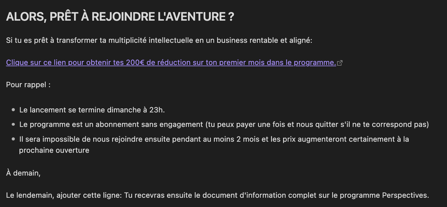 - Écrire les emails avec un teaser à la fin : Si tu souhaites en savoir plus sur le programme Perspectives, réponds simplement “Perspectives” à cet e-mail.