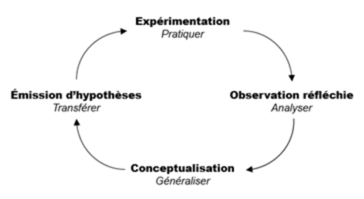 - l’émission d’hypothèses (Active Experimentation) l’apprenant peut émettre des hypothèses qui pourront être vérifiées lors de nouvelles expériences. C’est ainsi que la boucle continue et que de nouveaux apprentissages sont faits