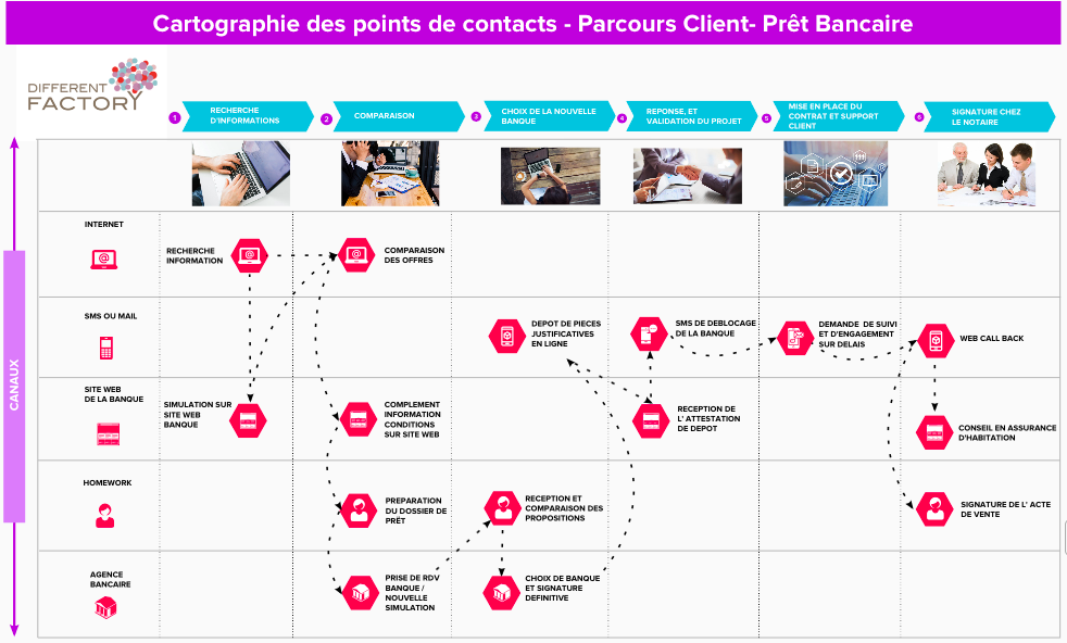 Les points de contact des Parcours client peuvent se représenter dans une experience map. https://www.differentfactory.com/role-points-de-contact/