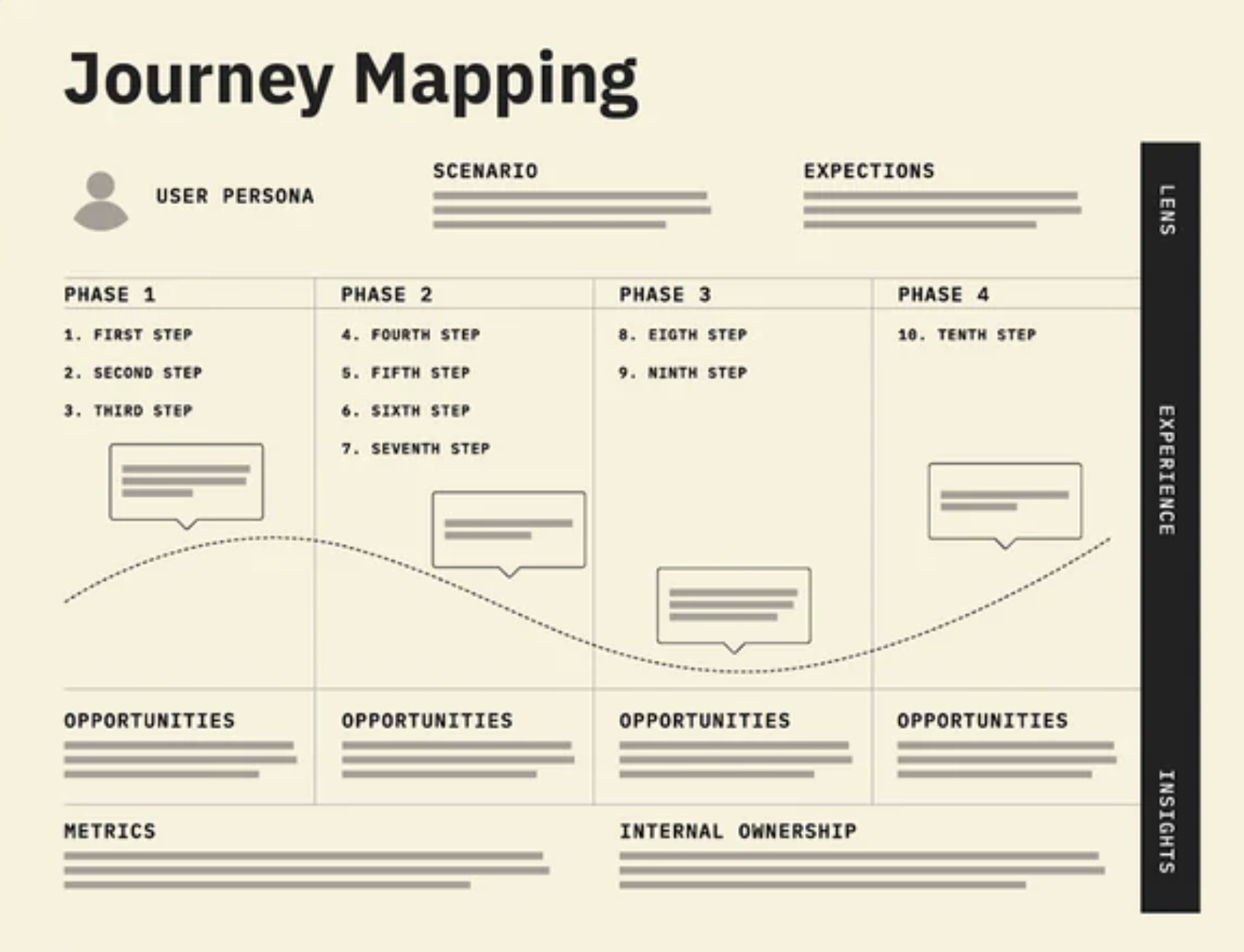 Lens Describe the user, their motivations and expectations within the specific scenario. For example, Jane (user) is using a ride-share service app to order a ride (scenario) that she expects to arrive at her exact location in 10 minutes or less (expectation). Experience Illustrate the actions and emotions of the user across a timeline. Use the Y axis to denote level of delight and frustration (as shown by the dotted line in the image above). The X axis is the different phases of the experience in time. Insights Identify opportunities to improve the experience. For example, give a real-time location of the driver to reduce the pain of waiting (opportunity). This feature will need to be developed by the product team (internal ownership) and can be monitored with post-ride ratings (metric).
