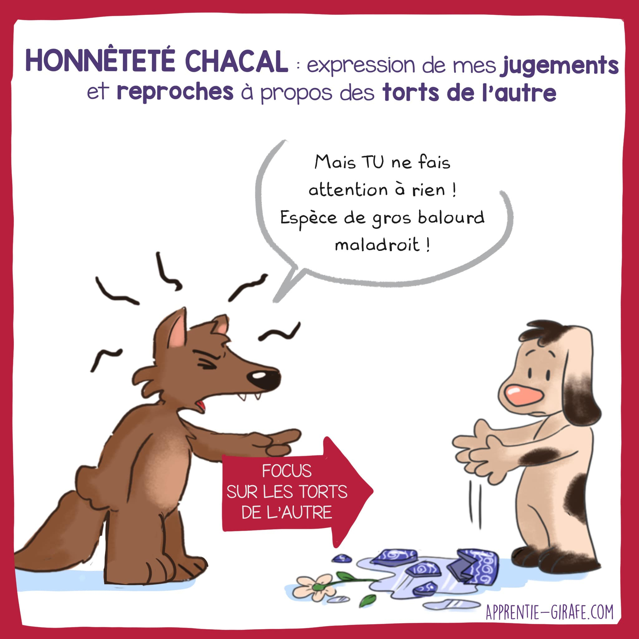 A l’inverse, dans un échange chacal, chacun exprime sa douleur d’une manière qui diminue les chances d’être entendu ( en blâmant l’autre ou en se blâmant soi ). Et reste incompris dans ce qu’il vit , ce qui ferme les cœurs et crée de l’éloignement