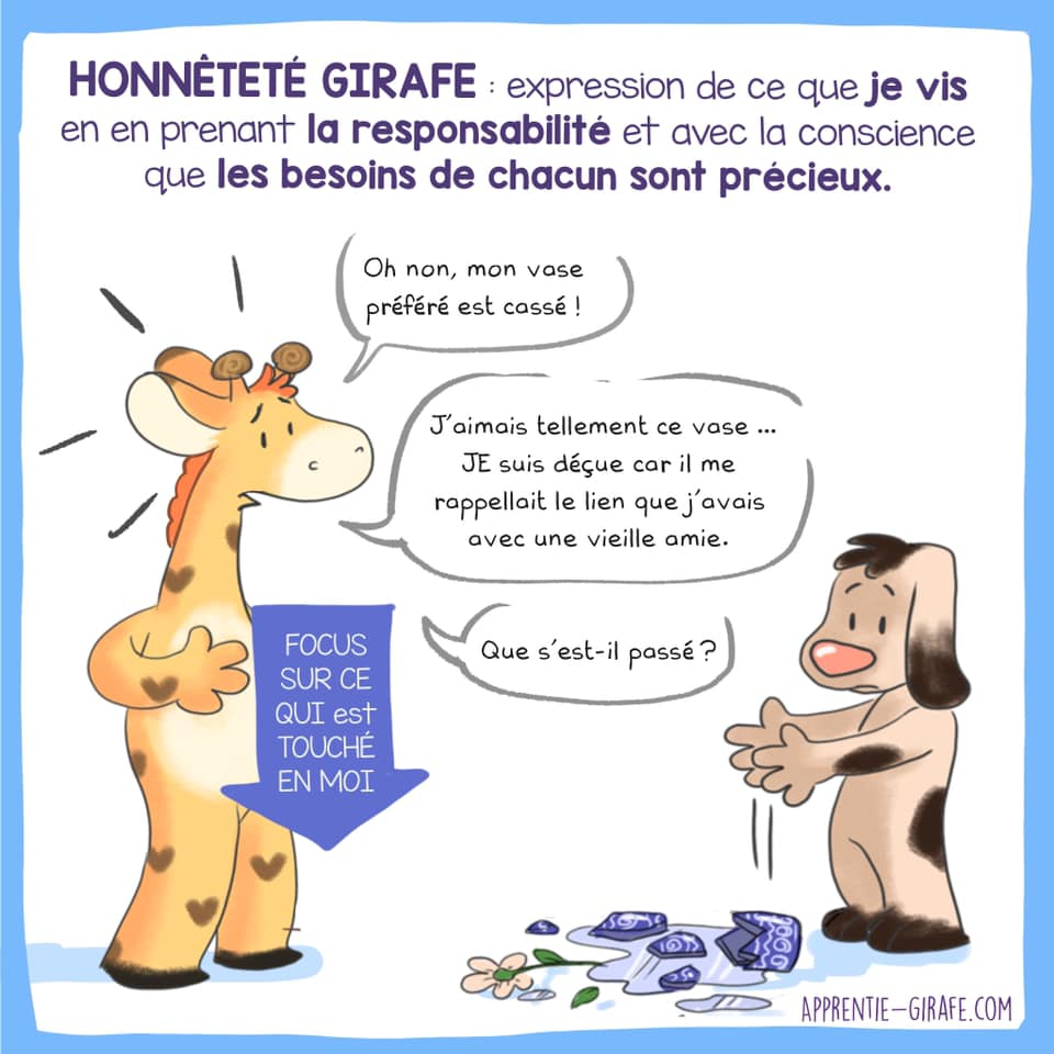 Dans un dialogue girafe, chacun aura l’espace d’exprimer ce qui est touché en lui avec authenticité et responsabilité ( sans blâmer l’autre. ) et il y aura de l’écoute pour chacun. Dans un espace, ou chacun peut etre pleinement lui meme et etre pleinement entendu, avec sa douleur ( de ne pas avoir contribuer ) et ses deuils ( l’objet qui n’est plus ) , le lien se vit et renforce la relation.