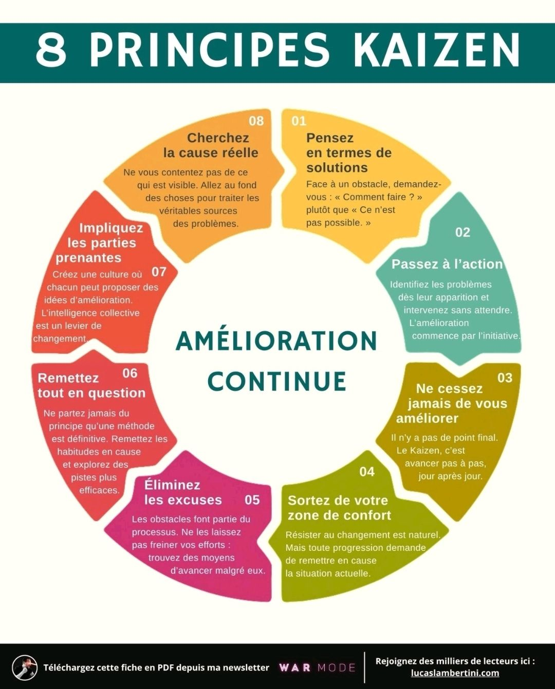 Le grand principe de Kaizen est de faire des petits pas, l’un après l’autre, jour après jour et semaine après semaine, pour Briser l’immobilisme, entrer en démarche d’Amélioration continue et profiter des intérêts composés (effet boule de neige). C’est comme ça que tu pourras apprendre efficacement.