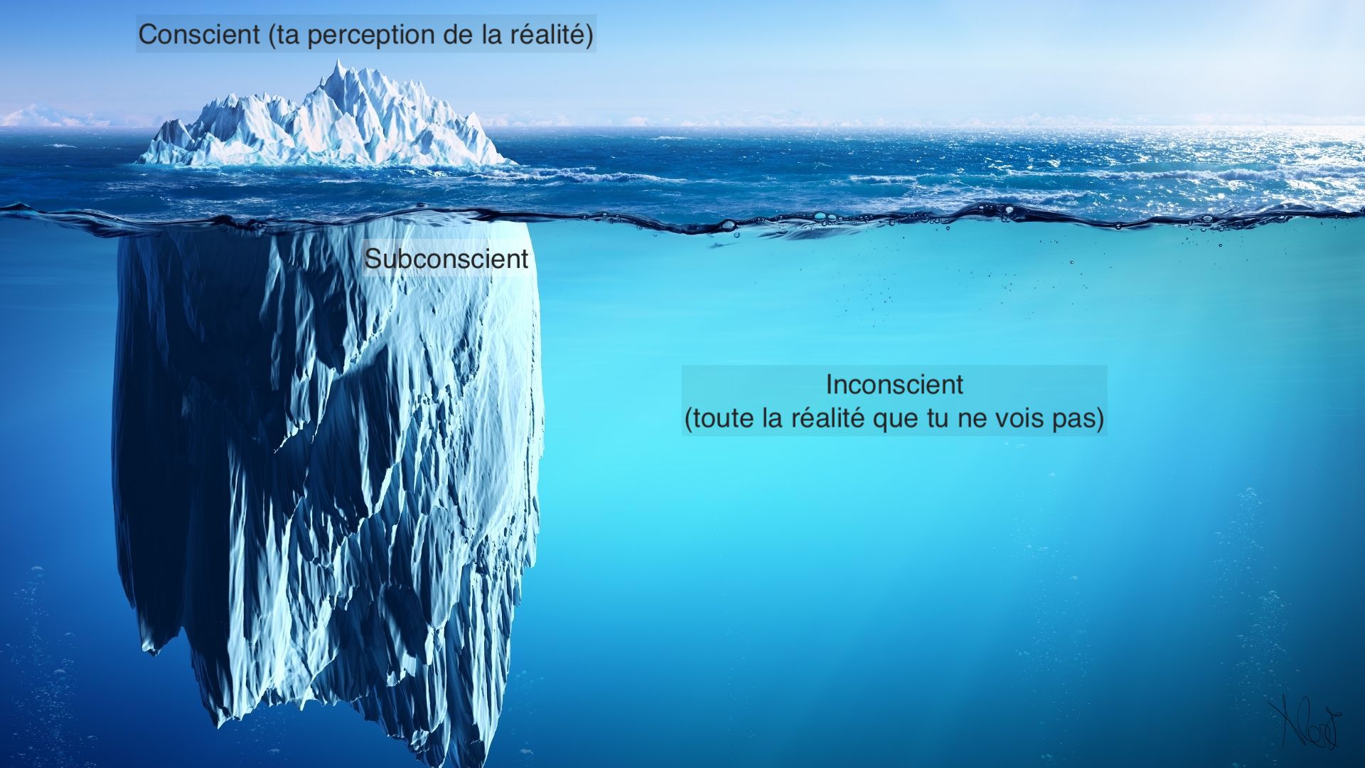 Même si on ne dirait pas, l’inconscient fait aussi parti de la réalité. Il est juste à l’horizon. L’inconscient existe et a une influence, il se manifeste donc dans ta conscience. Par définition, tout ce qui existe existe dans Ta conscience (ton Espace perceptif), sinon cela n’existerait pas.
